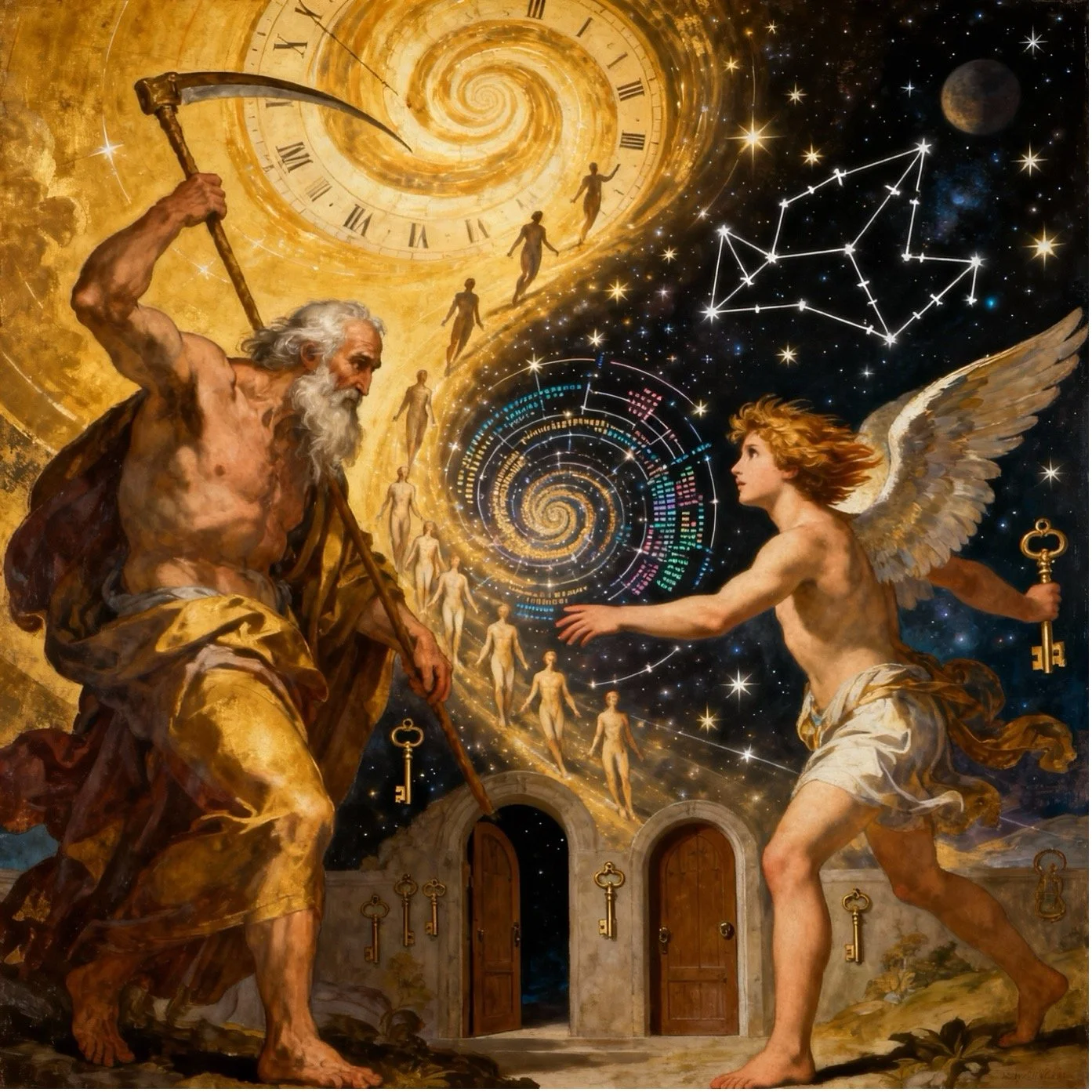 The Greeks understood that both were necessary. Chronos sustains; Kairos awakens. Chronos provides continuity; Kairos opens portals. In their tension lies the secret of individuation: the weaving of measured life with mythic breakthrough, code with cosmos.