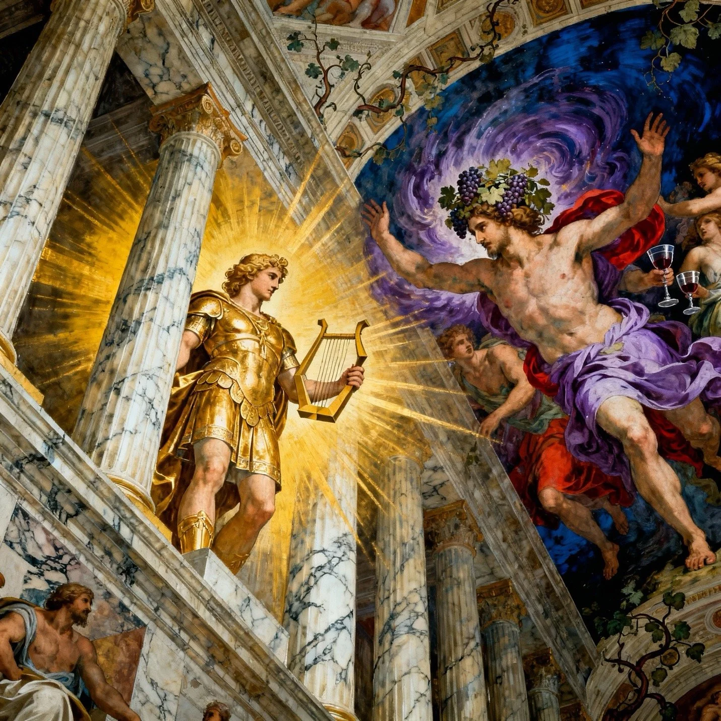 In the Greek imagination, no polarity was more powerful than that of Apollo and Dionysus. Apollo, radiant god of the sun, stood for clarity, order, and rational measure. He was the god of the lyre and the bow - precision instruments of harmony and distance. His temple at Delphi bore the inscription “Know Thyself”, a command to measure the boundaries of human reason against the infinite.